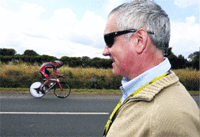 Christophe Marchadier, adjoint de Christian Prud’homme nous reçoit et nous informe que nous allons suivre la course contre la montre en voiture avec Andy Flickinger, ex-champion du Tour de France, grand par sa taille (1, 94 mètre) mais aussi par sa gentillesse….